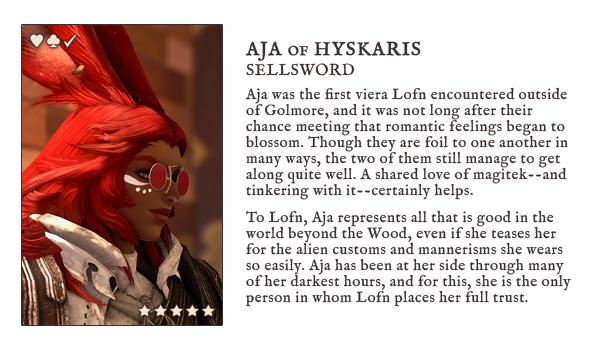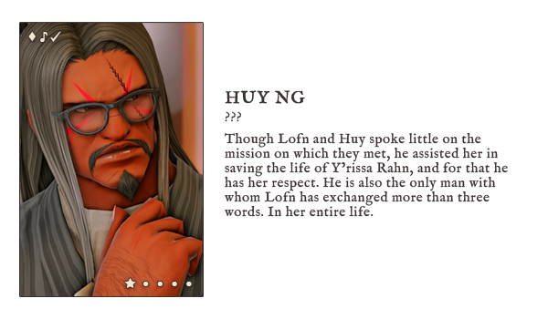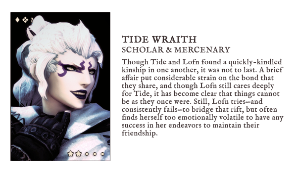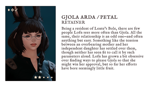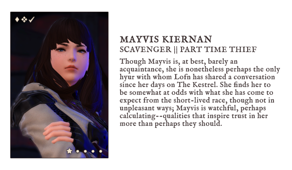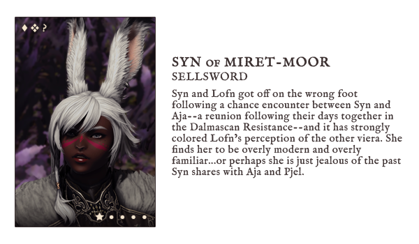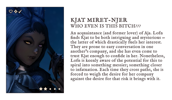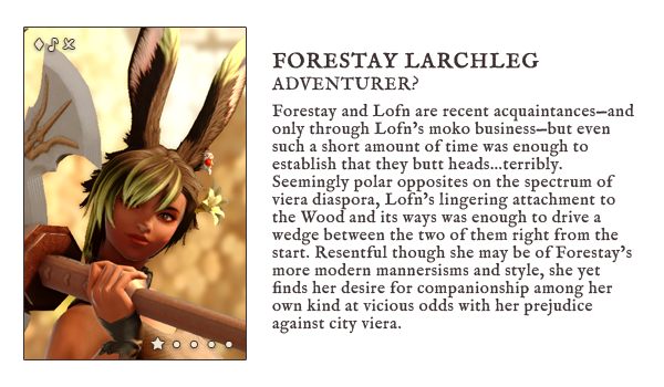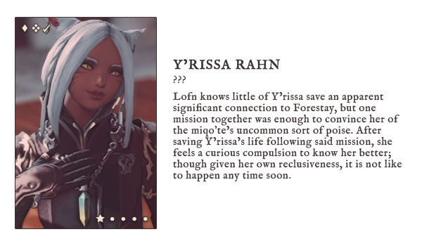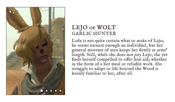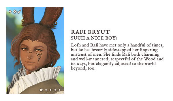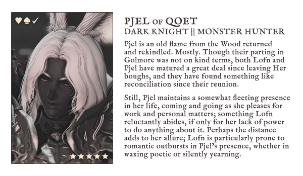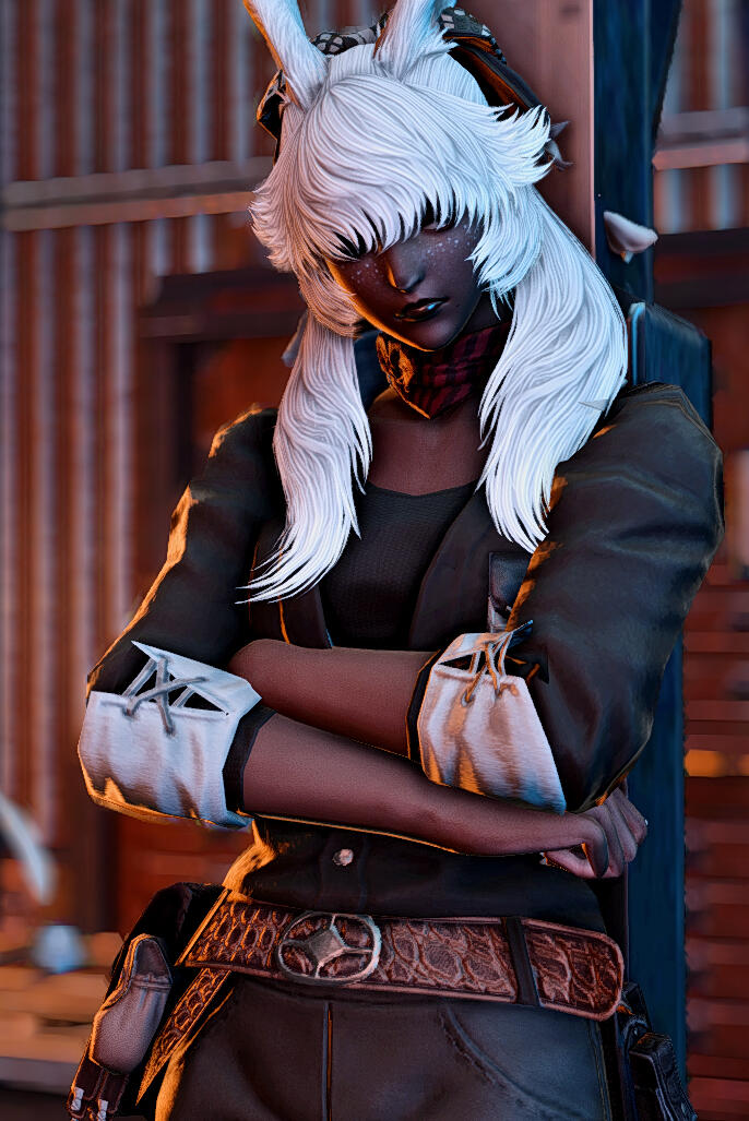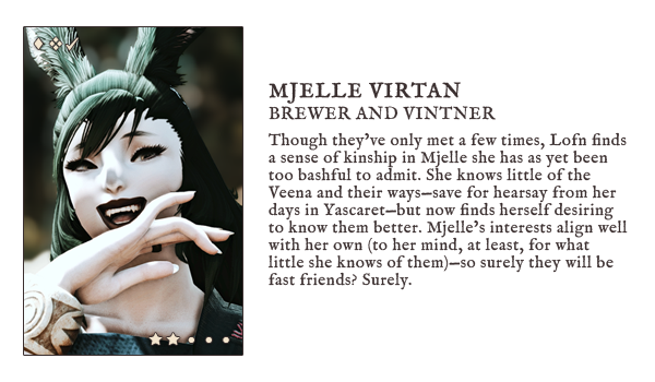 Appreciators of Moko. Lofn grows a few varieties of "moko" grass smuggled from Dalmasca, bred especially for potency and a more floral aroma. Characters who smoke, or are seeking pain or stress relief, may have purchased from her before, or may be pointed in her direction!Lente’s Bole. Viera immigrants feeling lost or displaced in a world not their own may well have caught wind of a home in Ul’dah for others such as them. Though not formally advertised as such, it has nonetheless become something of a gathering hub for drifters from Golmore and Skatay; one with clean, dry beds and a pantry that is always brimming with vieran home cooking.Sky Pirate. Lofn spent several years heckling the Garlean military and relieving them of their cargo alongside the crew of the sky pirate vessel, the Kestrel. Other sky pirates (or Garleans) from in and around Dalmasca may be familiar with her or her crew.Of the Wood. Before being exiled from Golmore, Lofn was given to wander throughout Her boughs well beyond the bounds Yascaret, often for long stretches of time. She is like to know and be known by any viera of Yascaret, but any village is possible given her wanderlust.Scrappers & Mechanics. While Lofn generally keeps to herself, she does spend quite a bit of time browsing scrap stalls and vendors in Kugane, Ishgard, and Ul'dah, taking particular interest in airship scrap and general magitek scrap. Purveyors of such scrap, or mechanical repair services, may have done business with her before.The Echo. Lofn has the Echo, though she is unaware that it is a condition others suffer—or even that it has a name. It manifests mostly as migraines, shared dreams, and unpredictable flashes of other people's (usually traumatic) memories. If you'd like Lofn to experience one of your character's memories, let's discuss it!